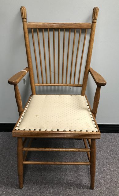Vintage Spindle Back Side Chair, primitive style, oak, fabric cushion, 40"h. Vintage Spindle Back Side Chair, primitive style, oak, fabric cushion, 40"h.