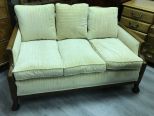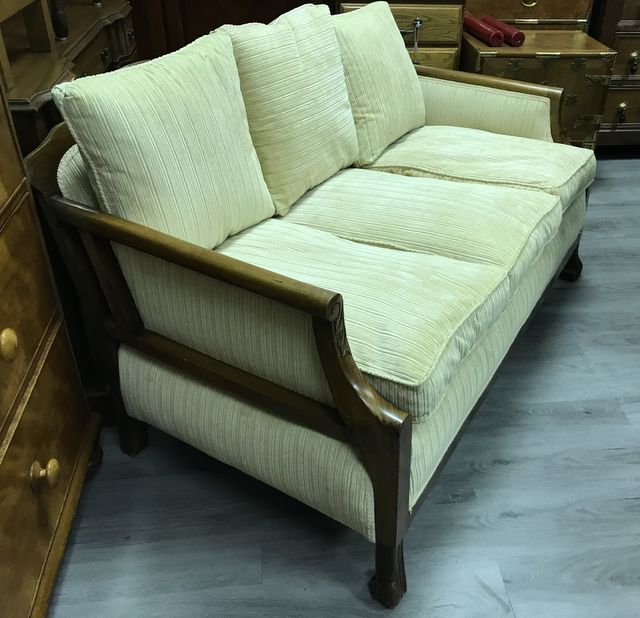 Antique Upholstered Settee, French style scroll foot, three cushion settee, has some finish wear, fabric is clean, 30"h., 53"w. Antique Upholstered Settee, French style scroll foot, three cushion settee, has some finish wear, fabric is clean, 30"h., 53"w.