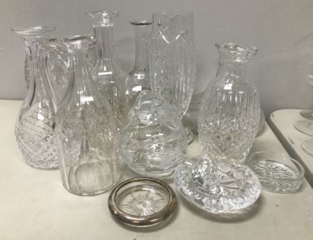 Pressed glass decanters, diamond pattern, cut glass ashtray, glass egg paperweight, etched footed bowl 7"h., no stoppers. Pressed glass decanters, diamond pattern, cut glass ashtray, glass egg paperweight, etched footed bowl 7"h., no stoppers.