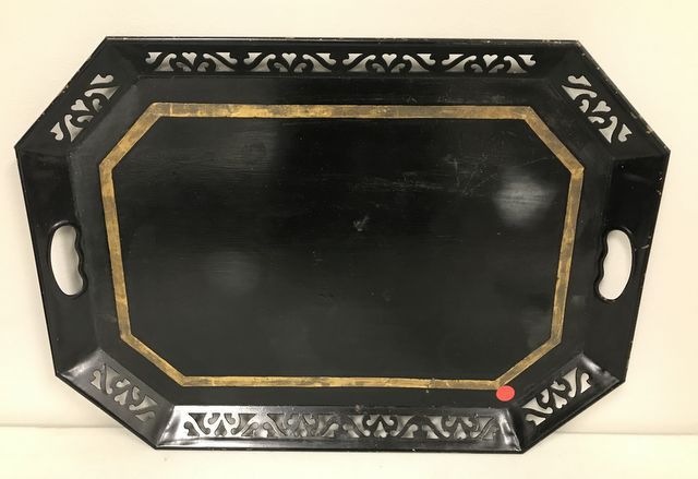 English Black Shape Tole Tray, painted black with gold inlaid, has use wear, 22"w. English Black Shape Tole Tray, painted black with gold inlaid, has use wear, 22"w.