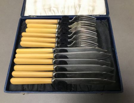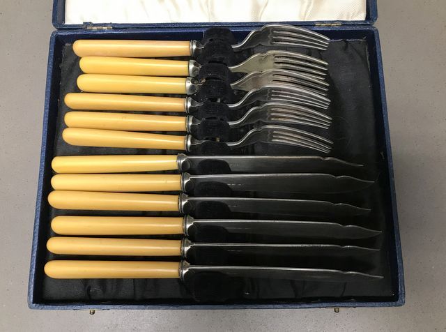 Vintage Knife and Fork set, Rodgers company, bakelite handles, in case. Vintage Knife and Fork set, Rodgers company, bakelite handles, in case.
