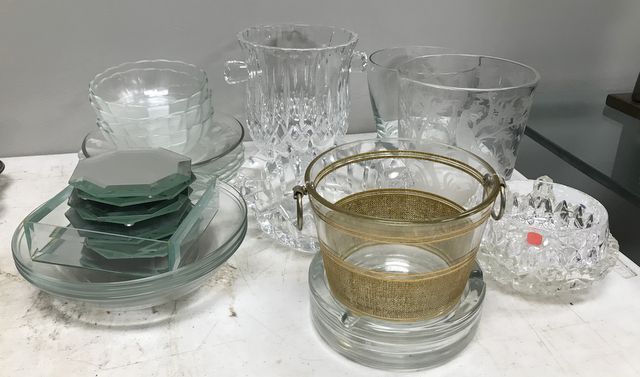 Clear glass bowls, heavy glass urn, bucket with gold gilt, and etc. Clear glass bowls, heavy glass urn, bucket with gold gilt, and etc.