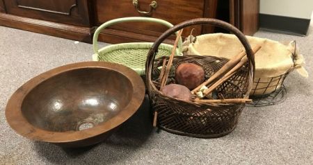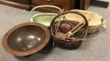 Group of Baskets and Metal Bucket, woven. Group of Baskets and Metal Bucket, woven.