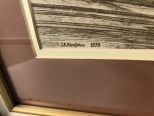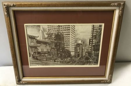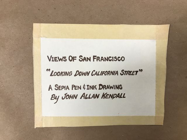Views of San Francisco by John Allan Kendall, "Looking Down California Street" , a sepia pen & ink drawing, matted, framed, 19"h., 23"w. Views of San Francisco by John Allan Kendall, "Looking Down California Street" , a sepia pen & ink drawing, matted, framed, 19"h., 23"w.