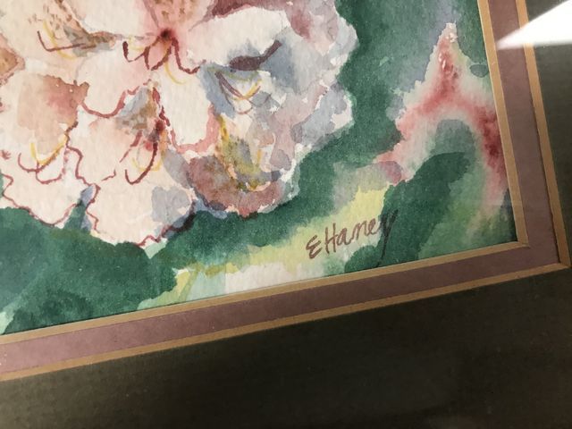 Watercolor of Flower by E. Haney, matted, framed, 10"h., 12"d. Watercolor of Flower by E. Haney, matted, framed, 10"h., 12"d.