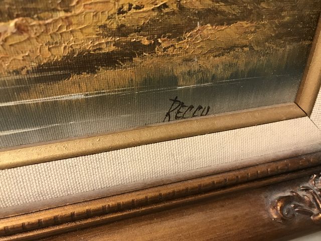 Oil Painting of Mountain Home Scene Signed Reccu, gold gilt framed, 13"h., 16"w. Oil Painting of Mountain Home Scene Signed Reccu, gold gilt framed, 13"h., 16"w.