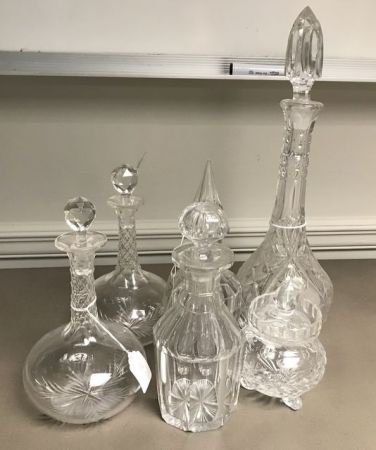Group of Glass decanters, etched designs, assorted sized with stoppers, also included jelly jar, tallest is 16"h. Group of Glass decanters, etched designs, assorted sized with stoppers, also included jelly jar, tallest is 16"h.