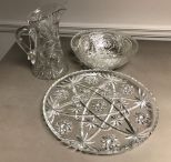 Pressed glass water pitcher 10"h., two pressed glass bowls, and pressed glass serving plate. Pressed glass water pitcher 10"h., two pressed glass bowls, and pressed glass serving plate.