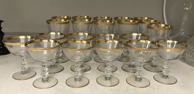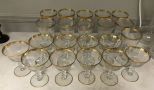 Gold Rim Clear Glass Stemware, goblets, and wine glasses, 21 total. Gold Rim Clear Glass Stemware, goblets, and wine glasses, 21 total.