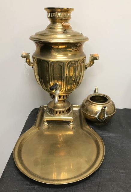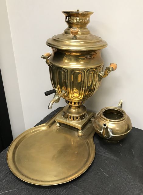 Antique Brass and Copper Samover, vintage, good condition, wood handles, 22"h. Antique Brass and Copper Samover, vintage, good condition, wood handles, 22"h.