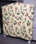 Upholstered White Headboard, floral slip cover and side skirts, 60" queen size, has bolt on metal rails. Upholstered White Headboard, floral slip cover and side skirts, 60" queen size, has bolt on metal rails.