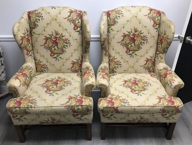 Pair of Upholstered Wing Back Chairs, arm chairs, Chippendale style, good condition, 43"h. Pair of Upholstered Wing Back Chairs, arm chairs, Chippendale style, good condition, 43"h.