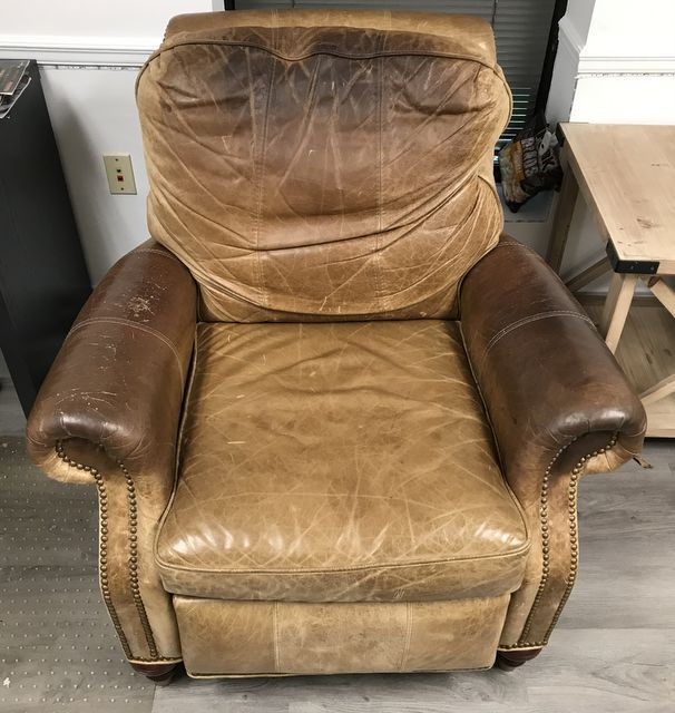 Worn Leather Arm Recliner, leather has wear, 36"h. Worn Leather Arm Recliner, leather has wear, 36"h.