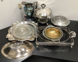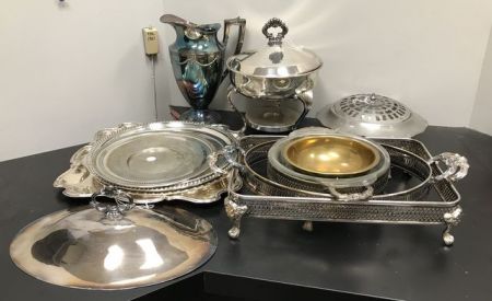 Silver plate pitcher, warmer dish, plates, bowls, cassorole stand, pewter piece, covered top. Silver plate pitcher, warmer dish, plates, bowls, cassorole stand, pewter piece, covered top.