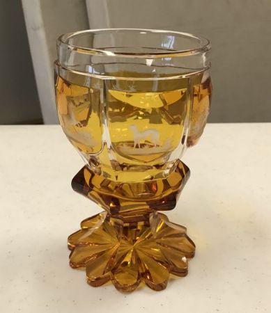 Glass amber art cup, etched animal artwork, 6"h. Glass amber art cup, etched animal artwork, 6"h.