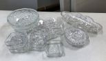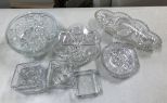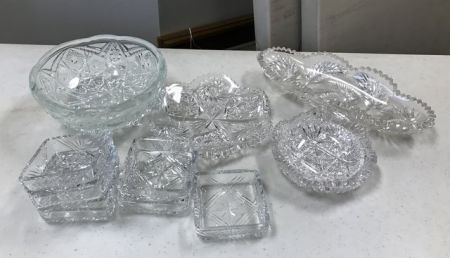 Group of Pressed Glass and Cut Glass Pieces, banana tray, footed bowl, dishes. Group of Pressed Glass and Cut Glass Pieces, banana tray, footed bowl, dishes.