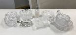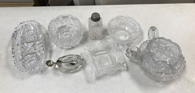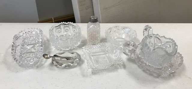 Pressed glass and cut glass pieces, dishes, salt, tray, bowl. Pressed glass and cut glass pieces, dishes, salt, tray, bowl.