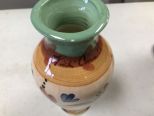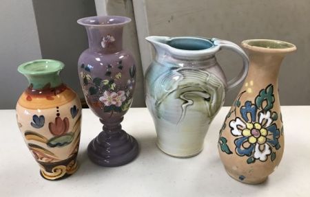 Vicki Carrol hand painted vase 6 1/2"h., art glass 9"h with floral artwork, pottery pitcher and vase. Vicki Carrol hand painted vase 6 1/2"h., art glass 9"h with floral artwork, pottery pitcher and vase.