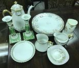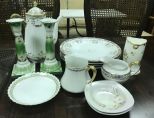 Hand painted candle holders, pitcher, dinner plates, creamer, bowls. Melto China plates, Cauldont vase, Nippon pitcher with repaired lid 9"h. Hand painted candle holders, pitcher, dinner plates, creamer, bowls. Melto China plates, Cauldont vase, Nippon pitcher with repaired lid 9"h.
