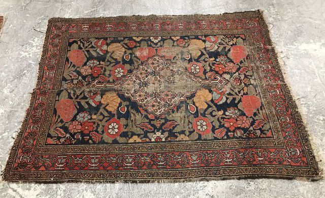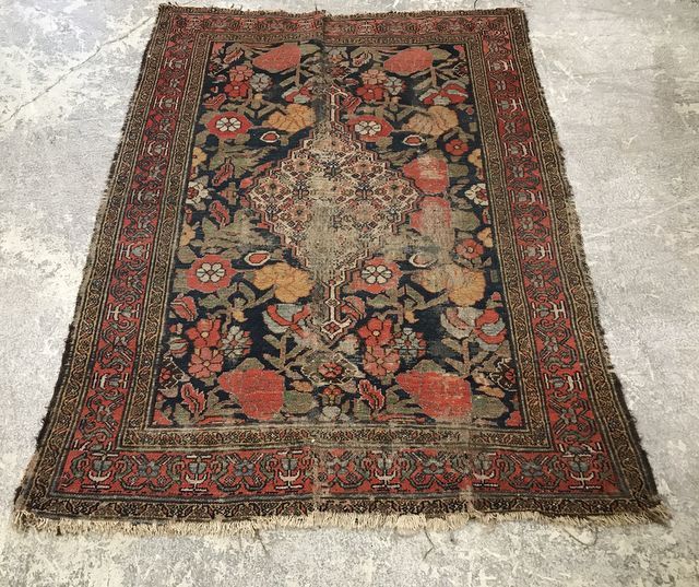 Vintage Wool Persian Area Rug, low pile, has worn areas, red, navy blue, 3'8 x 4'8. Vintage Wool Persian Area Rug, low pile, has worn areas, red, navy blue, 3'8 x 4'8.