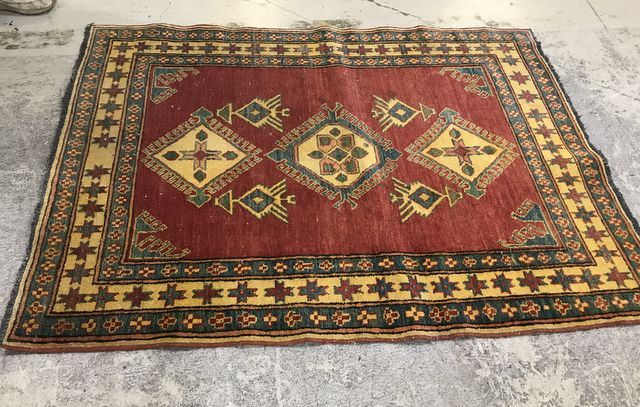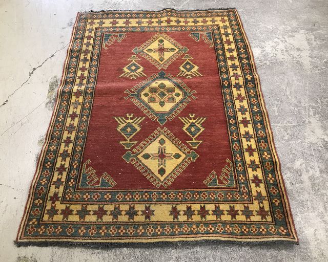 Khan International Hand Woven Area Rug, good condition, reds, yellow, blue, wool, 3'9 x 5'4. Khan International Hand Woven Area Rug, good condition, reds, yellow, blue, wool, 3'9 x 5'4.
