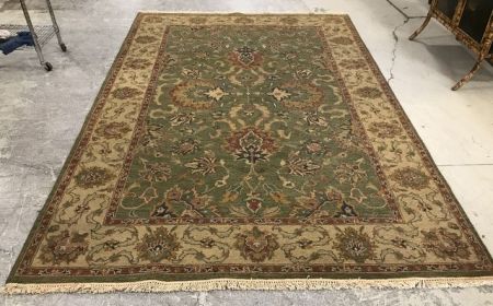 Hand Woven Wool Oushak Area Rug, needs cleaning, green, tan, 6' x 8' Hand Woven Wool Oushak Area Rug, needs cleaning, green, tan, 6' x 8'