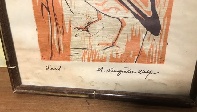 Quail Block Print by Mildred Wolfe, bamboo framed, has water damage on bottom section, 12"h., 9"w. Quail Block Print by Mildred Wolfe, bamboo framed, has water damage on bottom section, 12"h., 9"w.