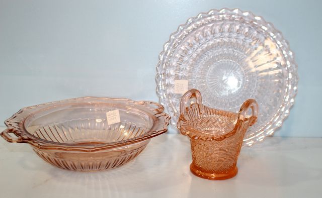 Pink depression plate 10" ; pink bowl 11 1/2" dia. ; basket 4 1/2" dia., 4 1/2" h. Pink depression plate 10" ; pink bowl 11 1/2" dia. ; basket 4 1/2" dia., 4 1/2" h.
