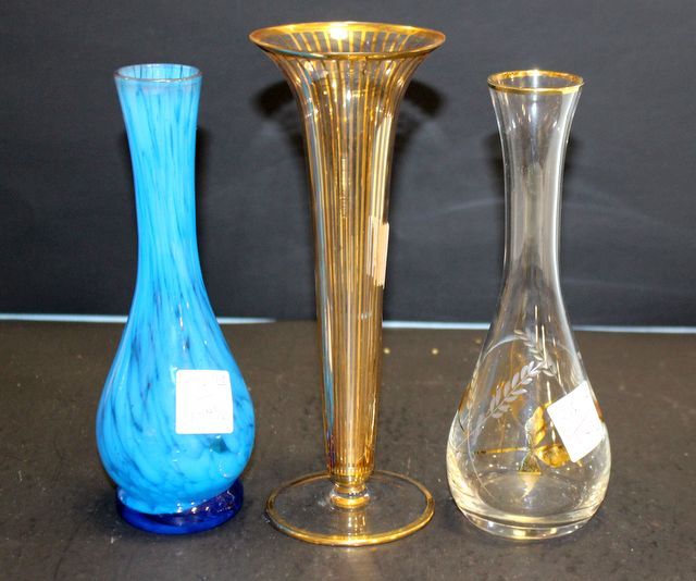 Two gold designed and one blue art glass Two gold designed and one blue art glass