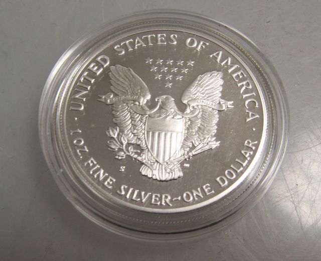 Proof, San Francisco mint, S mark, 99.99 %, 1 troy ounce, bullion coin, in case. Proof, San Francisco mint, S mark, 99.99 %, 1 troy ounce, bullion coin, in case.