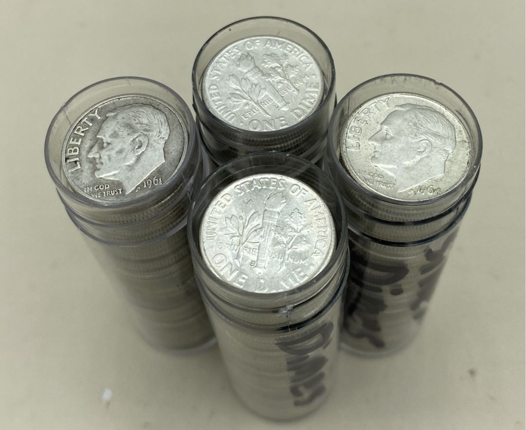 Four Rolls of Silver Roosevelt Dimes 200 Dimes. 2 rolls 1964, one 1956 and one 1961. Four Rolls of Silver Roosevelt Dimes 200 Dimes. 2 rolls 1964, one 1956 and one 1961.