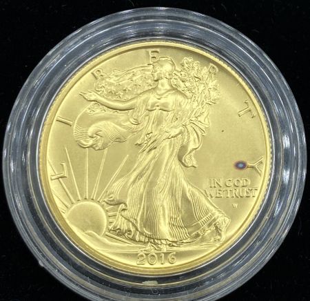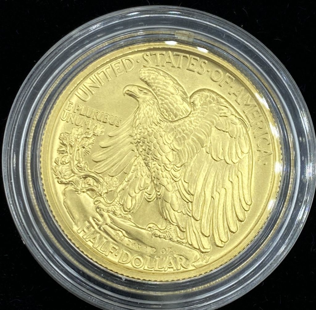 2016-W US Mint Walking Liberty Half Dollar Centennial Gold Coin Proof; Box + Certification; 99.99% Au; 1/2 Troy oz.; Starting to tone; See front of coin above: "In God We Trust"; Displays rainbow hues; 2016-W US Mint Walking Liberty Half Dollar Centennial Gold Coin Proof; Box + Certification; 99.99% Au; 1/2 Troy oz.; Starting to tone; See front of coin above: "In God We Trust"; Displays rainbow hues;