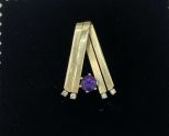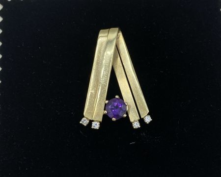 Ladies 14k Gold Peaked Amethyst + Diamond Slide Pendant; Unstamped/Tested; Genuine/Tested Diamonds; Natural Amethyst; Geometric Peak Design; Appears Custom Made; 1.25"L. Ladies 14k Gold Peaked Amethyst + Diamond Slide Pendant; Unstamped/Tested; Genuine/Tested Diamonds; Natural Amethyst; Geometric Peak Design; Appears Custom Made; 1.25"L.