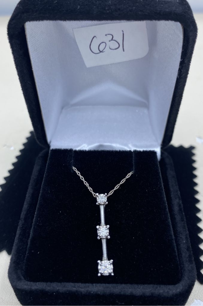 Ladies 10k White Gold Gradient (Genuine/Tested) Diamond Bar 18" (Length Chain) Drop Necklace; Stamped, Tested, and Hallmarked with "B" Initial inside Texas Outline; 1"L Pendant; .22ctw Diamonds; Dainty Chain. Ladies 10k White Gold Gradient (Genuine/Tested) Diamond Bar 18" (Length Chain) Drop Necklace; Stamped, Tested, and Hallmarked with "B" Initial inside Texas Outline; 1"L Pendant; .22ctw Diamonds; Dainty Chain.
