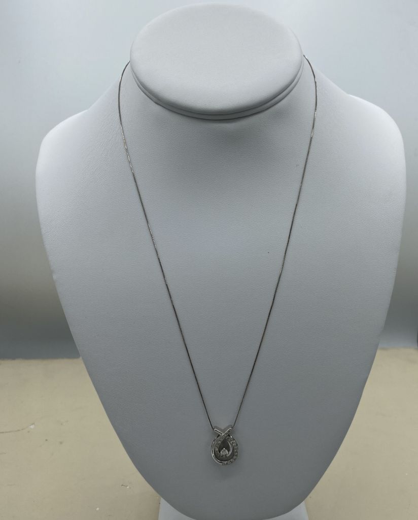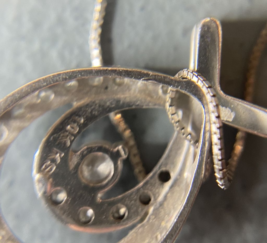 Ladies 10k White Gold Floating .15ct (Approximated) (Genuine/Tested) Diamond Center Ribboned Adjustable Length Drop Necklace; Stamped, Tested, and Hallmarked "K.S."; Diamond Accents on Ribbon Detail. Ladies 10k White Gold Floating .15ct (Approximated) (Genuine/Tested) Diamond Center Ribboned Adjustable Length Drop Necklace; Stamped, Tested, and Hallmarked "K.S."; Diamond Accents on Ribbon Detail.