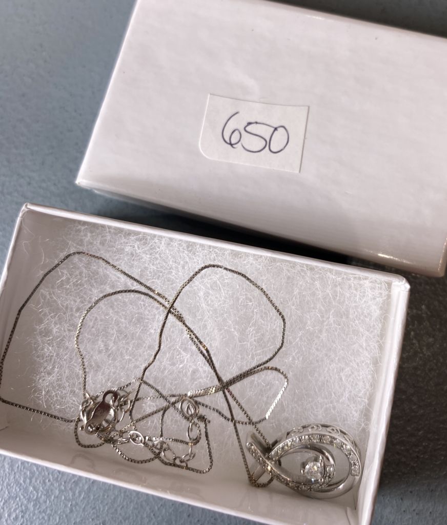 650 Ladies 10k White Gold Floating .15ct Diamond Center Ribboned Adjustable Length Drop Necklace