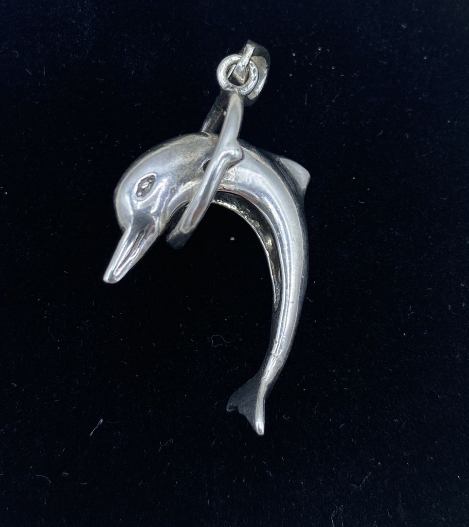 Solid Sterling (925) Silver Playful Dolphin Drop Pendant; Stamped on bail; Moveable; Solid Sterling (925) Silver Playful Dolphin Drop Pendant; Stamped on bail; Moveable;