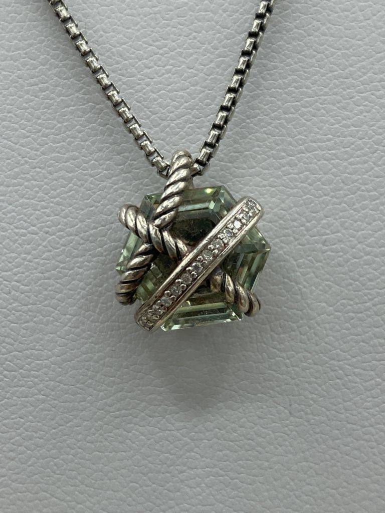 Ladies "David Yurman" Sterling (925) Silver Prasiolite (Green Quartz) + Diamond Hexagon Cable Cross Adjustable (16"-18" Length) Necklace; Stamped and Hallmarked; Genuine Diamond Accents; Ladies "David Yurman" Sterling (925) Silver Prasiolite (Green Quartz) + Diamond Hexagon Cable Cross Adjustable (16"-18" Length) Necklace; Stamped and Hallmarked; Genuine Diamond Accents;