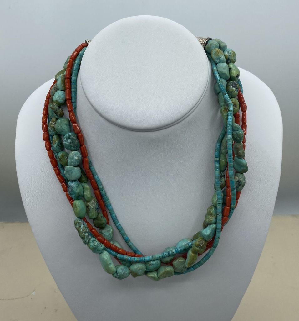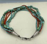 769 Tibetan Made Sterling Silver Capped Turquoise + Coral Multi Strand Beaded Necklace