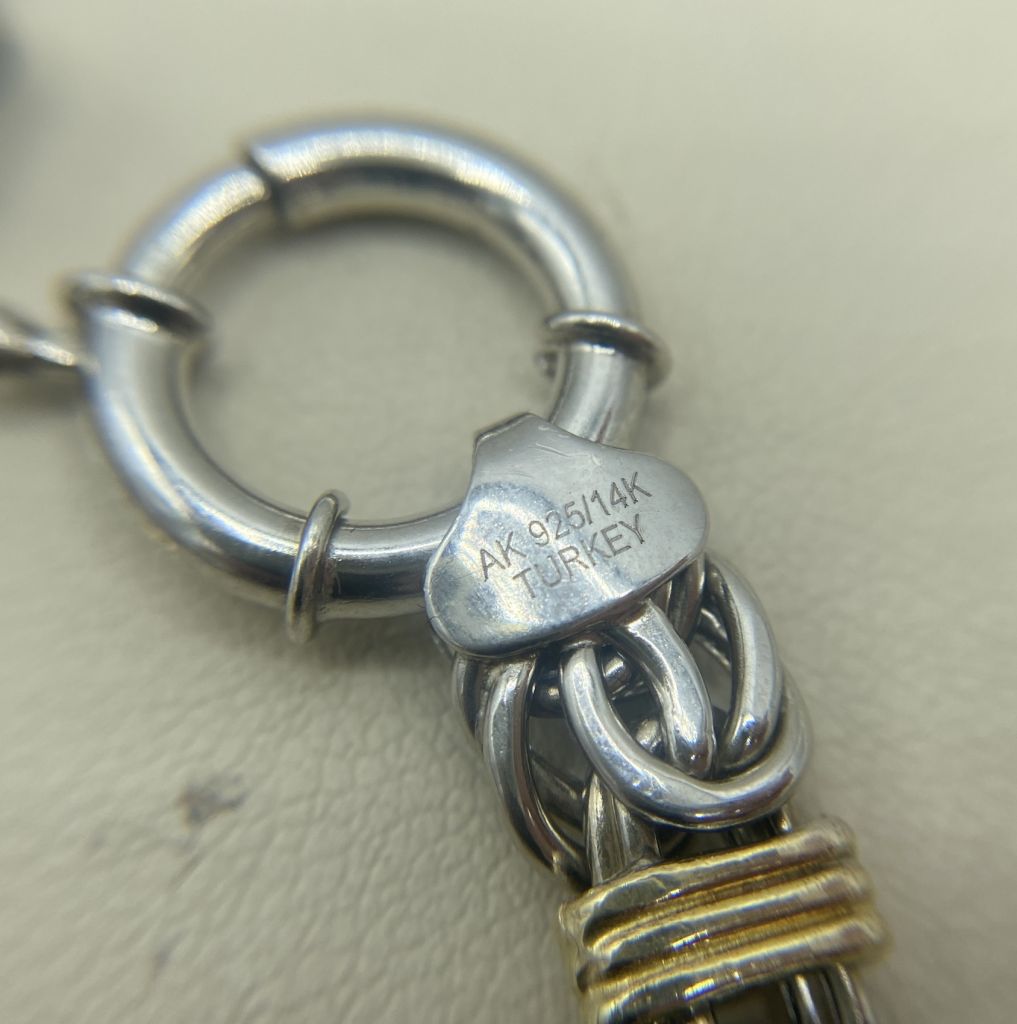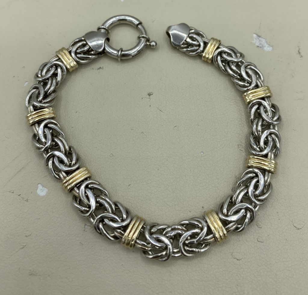 787 Turkish Sterling Silver + 14k Gold Accented Byzantine Link Spring Ring 7" Bracelet