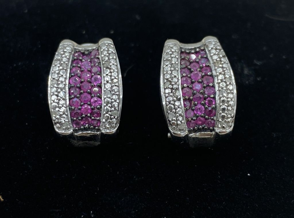 Ladies Sterling (925) Silver Pave (Setting) Natural Ruby + Genuine (Tested) Diamond Omega Clip (Closure) Lobe Hugger Hoop Earring; Stamped and Hallmarked; Great Condition and Quality Made; Untreated Rubies; Ladies Sterling (925) Silver Pave (Setting) Natural Ruby + Genuine (Tested) Diamond Omega Clip (Closure) Lobe Hugger Hoop Earring; Stamped and Hallmarked; Great Condition and Quality Made; Untreated Rubies;