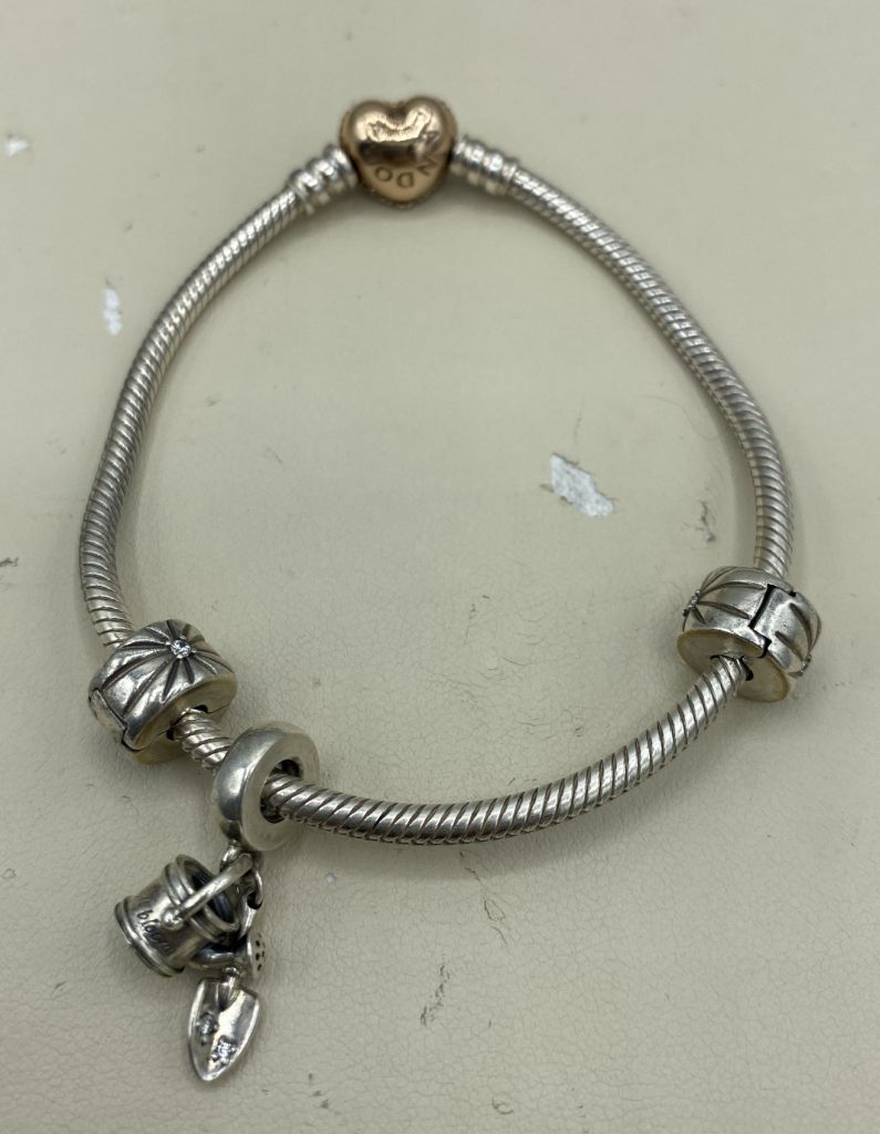 798 Ladies "Pandora" Sterling Silver 7" Cable Charm Bracelet + "Pandora" Gardening Charm