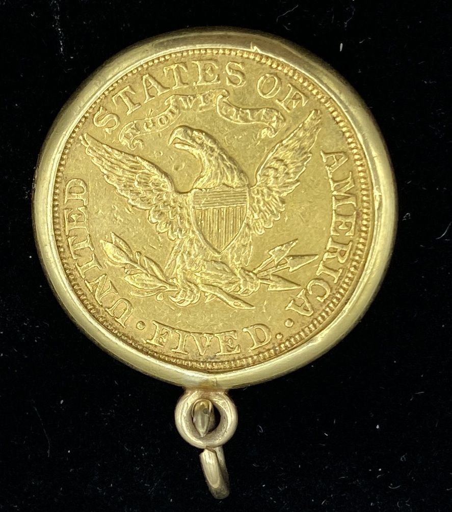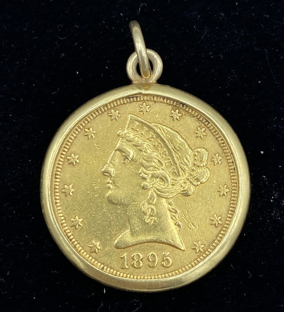 United States c.1895 $5 Gold Liberty Head Gold Coin + 14k Pendant Bezel; 90% Gold (21.6k) Coin; Set in Unstamped/Tested 14k Bezel United States c.1895 $5 Gold Liberty Head Gold Coin + 14k Pendant Bezel; 90% Gold (21.6k) Coin; Set in Unstamped/Tested 14k Bezel