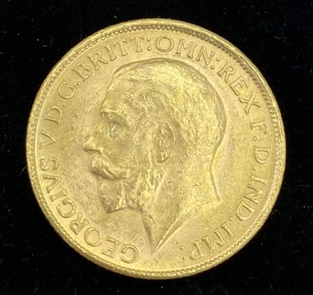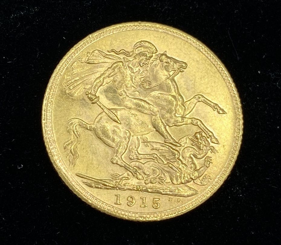 Australian c.1915-M King George V Gold Sovereign; Traditional George and Dragon Reverse; M mintmark; 916.7% Gold (22k). Australian c.1915-M King George V Gold Sovereign; Traditional George and Dragon Reverse; M mintmark; 916.7% Gold (22k).
