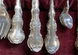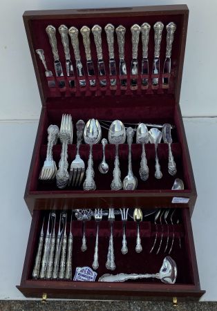 12 Place Setting of Gorham "Strasbourg" Pattern Sterling Silver Flatware Set + Serving Pieces; Can be polished; Has box; Some wear and patina may be present; Stamped and Hallmarked; Includes the following: 19x - Stainless Blade + Sterling Handle Knives *Some slight variances in shape; All have the same length: 9.5"L (Approximate) 13x - Salad Forks 12 - Dinner Forks 4x - Serving Forks 4x - Pierced Serving Spoon 4x - Solid Serving Spoon 8x - Demitasse Spoons 9x - Ice Tea Spoons 12x - Spoons 11x - Solid Butter Knives 2x - Baby Forks 2x - Baby Spoons 1x - Salt Spoon 6x - Gold Washed Bowl Demitasse Spoons 2x - Berry Forks 3x - Cocktail/Olive Forks 1x - Specialty Fork 1x - Pierced Bon Bon Spoon 1x - Sugar Spoon 1x - Large Ladle 1x - Small Ladle 1x - Solid Cheese/Master Butter Knife 1x - Stainless Blade + Sterling Handle Cheese Knife 1x - Stainless Blade + Sterling Handle Specialty Serving Knife 1x - Stainless Blade + Sterling Handle Meat Carving Knife 1x - Stainless Blade + Sterling Handle Mead Carving Fork 12 Place Setting of Gorham "Strasbourg" Pattern Sterling Silver Flatware Set + Serving Pieces; Can be polished; Has box; Some wear and patina may be present; Stamped and Hallmarked; Includes the following: 19x - Stainless Blade + Sterling Handle Knives *Some slight variances in shape; All have the same length: 9.5"L (Approximate) 13x - Salad Forks 12 - Dinner Forks 4x - Serving Forks 4x - Pierced Serving Spoon 4x - Solid Serving Spoon 8x - Demitasse Spoons 9x - Ice Tea Spoons 12x - Spoons 11x - Solid Butter Knives 2x - Baby Forks 2x - Baby Spoons 1x - Salt Spoon 6x - Gold Washed Bowl Demitasse Spoons 2x - Berry Forks 3x - Cocktail/Olive Forks 1x - Specialty Fork 1x - Pierced Bon Bon Spoon 1x - Sugar Spoon 1x - Large Ladle 1x - Small Ladle 1x - Solid Cheese/Master Butter Knife 1x - Stainless Blade + Sterling Handle Cheese Knife 1x - Stainless Blade + Sterling Handle Specialty Serving Knife 1x - Stainless Blade + Sterling Handle Meat Carving Knife 1x - Stainless Blade + Sterling Handle Mead Carving Fork