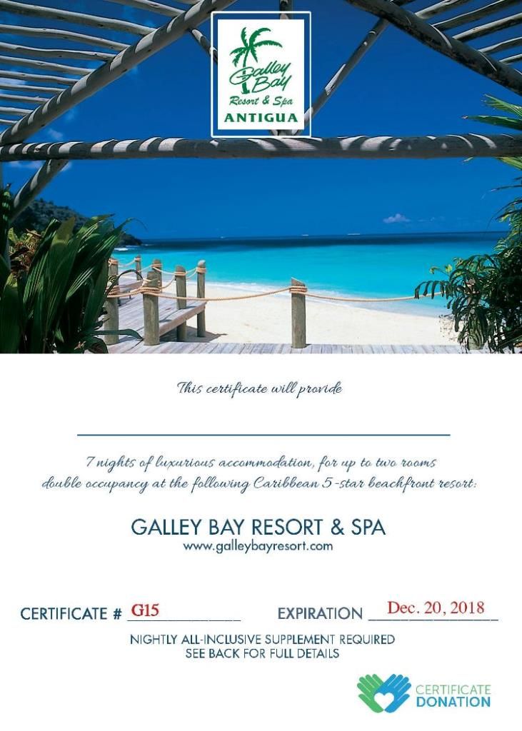 Antigua. Beachfront accommodations. 7 Nights at the Gallery Bay Resort & Spa. 40 acre exotic paradise surrounded by tranquil bird sanctuary and white sand beach. Adults only. $3,500.00 retail value. Galley Bay Resort & Spa is situated on the northwest coast of Antigua, a 40 acre exotic paradise surrounded by a tranquil bird sanctuary and 3/4-mile-long stretch of white sand beach along the crystal blue Caribbean Sea. An intimate hideaway for discerning adult travelers, this award-wining resort features just 98 accommodations, spectacular sunset views, sumptuous beachside dining, watersports, romance, & relaxing Indulge Spa. All Certificate Donations are subject to a required all-inclusive nightly supplement + tax, per person, that provides all dining, beverages, resort activities, service charges, & gratuities. Airfare is not included, however assistance may be provided for air travel. Additional peak season surcharge of $100 per person, per night applies Dec. 21 -Apr.15. Antigua. Beachfront accommodations. 7 Nights at the Gallery Bay Resort & Spa. 40 acre exotic paradise surrounded by tranquil bird sanctuary and white sand beach. Adults only. $3,500.00 retail value. Galley Bay Resort & Spa is situated on the northwest coast of Antigua, a 40 acre exotic paradise surrounded by a tranquil bird sanctuary and 3/4-mile-long stretch of white sand beach along the crystal blue Caribbean Sea. An intimate hideaway for discerning adult travelers, this award-wining resort features just 98 accommodations, spectacular sunset views, sumptuous beachside dining, watersports, romance, & relaxing Indulge Spa. All Certificate Donations are subject to a required all-inclusive nightly supplement + tax, per person, that provides all dining, beverages, resort activities, service charges, & gratuities. Airfare is not included, however assistance may be provided for air travel. Additional peak season surcharge of $100 per person, per night applies Dec. 21 -Apr.15.