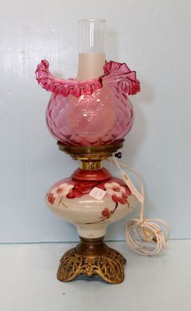 233 Pink Flowered Converted Lamp with Pink Ruffled Shade