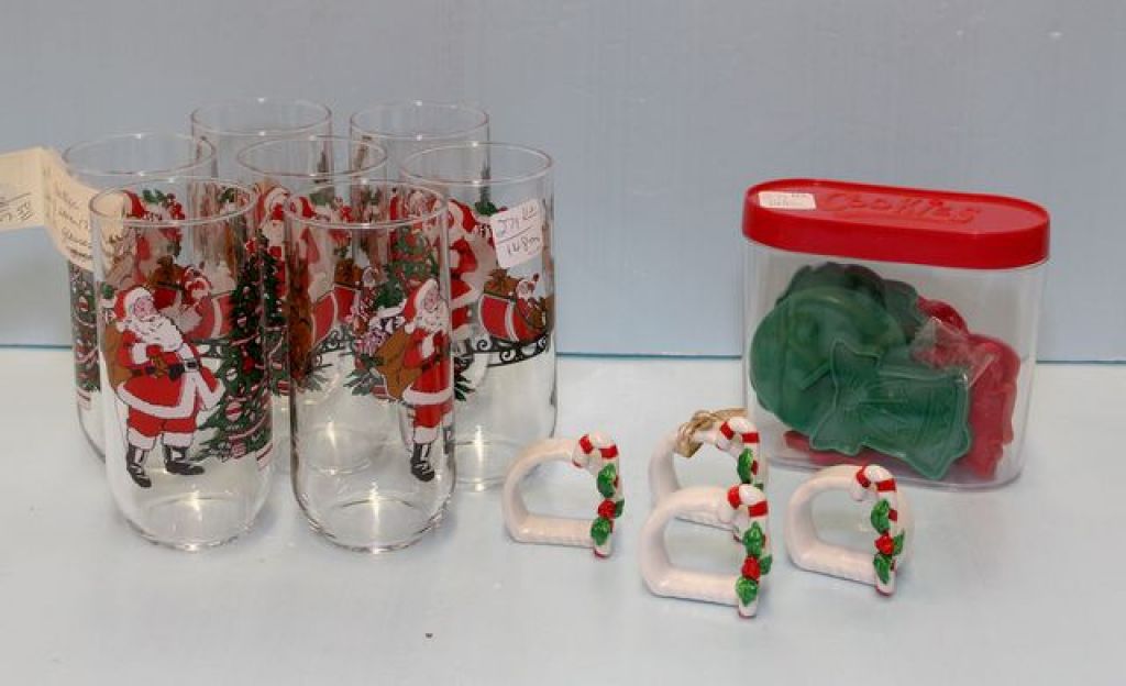 Cookie cutters, four candy cane napkin rings & seven Santa glasses Cookie cutters, four candy cane napkin rings & seven Santa glasses