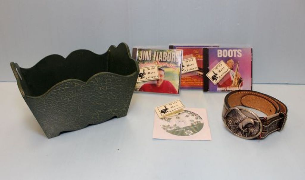 Green and gold wood box, four CDs, cassette & belt Green and gold wood box, four CDs, cassette & belt