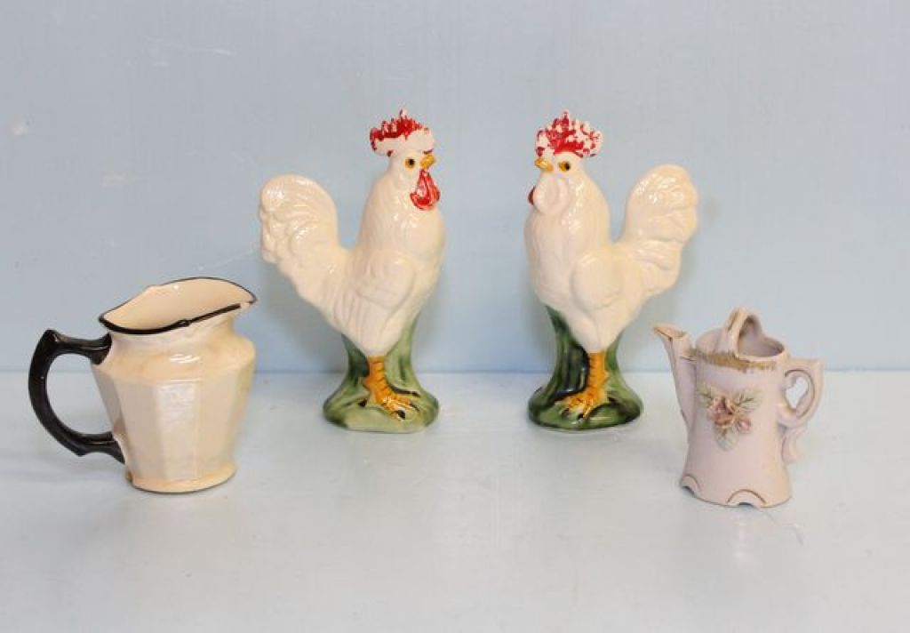 411 Two Porcelain Roosters & Two Creamers